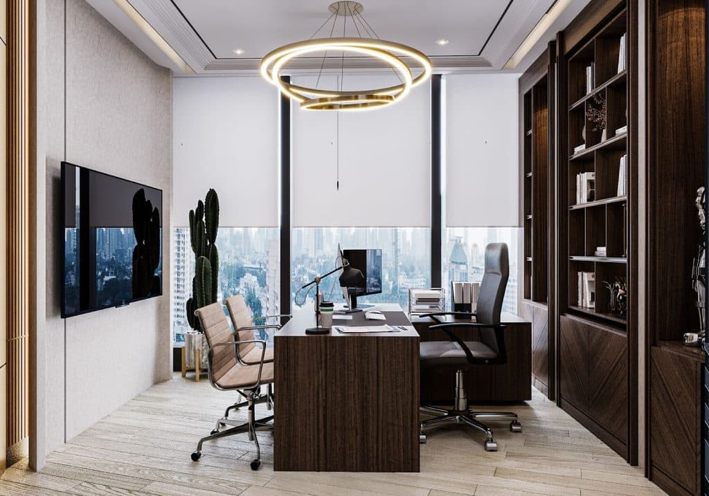 Tekstur lembut pada karpet atau tirai juga memperkuat suasana homey. Ruang seperti ini tidak hanya memantulkan kepribadian sang direktur, tetapi juga membangun kedekatan emosional dengan ruang kerjanya—sebuah ruang yang benar-benar “hidup”.