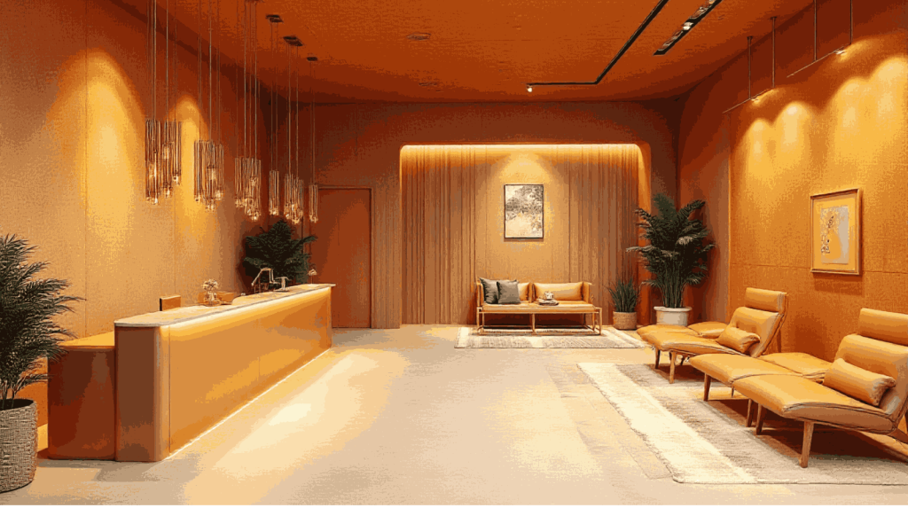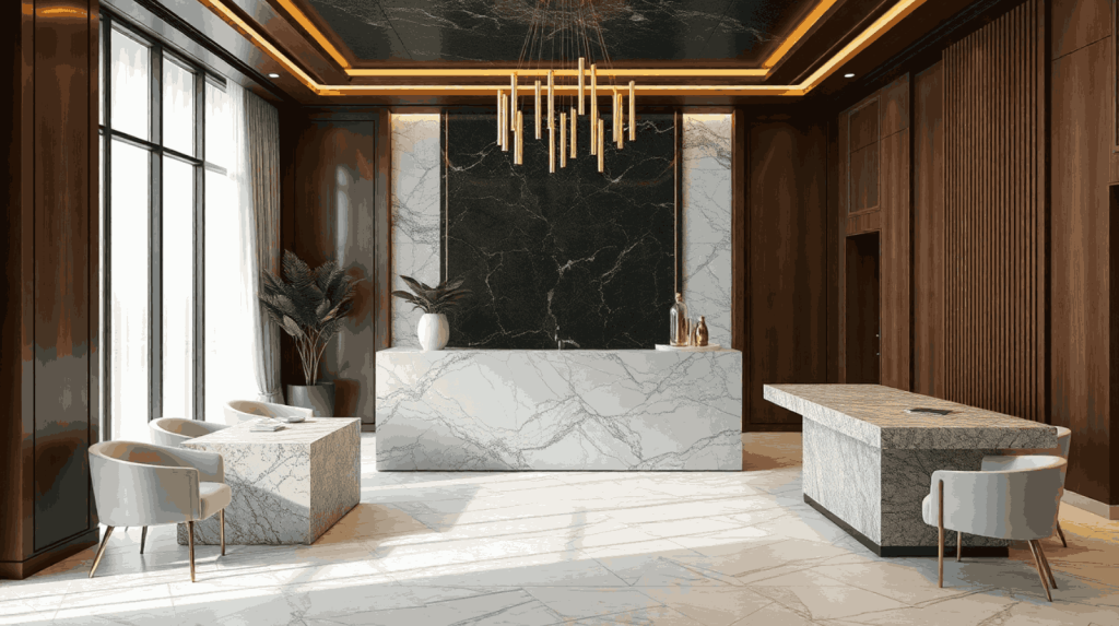 Kombinasikan dengan logam berwarna gold atau brass untuk menambah kesan eksklusif. Gaya ini sangat cocok untuk hotel butik, klinik estetika, atau perusahaan premium yang ingin memancarkan prestise dan profesionalisme tinggi.