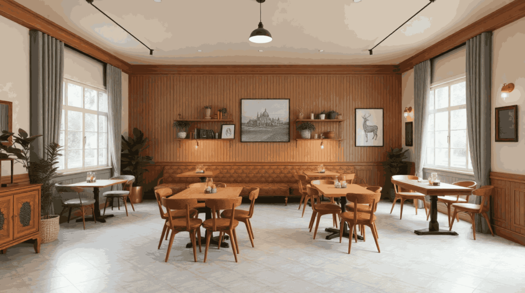 Bagi bisnis dengan karakter tradisional-modern, gaya vintage adalah pilihan yang menggoda. Gunakan palet warna cokelat, krem, dan ivory dengan tekstur kayu atau ubin bermotif klasik. Sentuhan modern bisa dihadirkan melalui pencahayaan LED atau furnitur glossy yang memberi kontras.