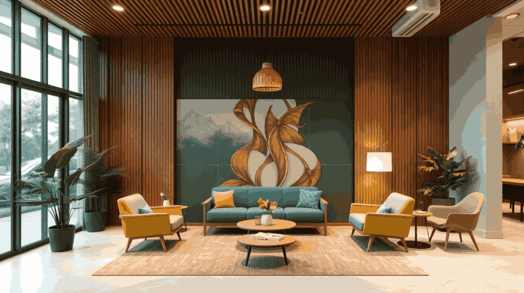 Bagi brand lifestyle atau kafe, area resepsionis bisa menjadi “panggung visual” yang memperkenalkan karakter bisnis. Gunakan mural artistik, instalasi cahaya interaktif, atau dinding bertekstur unik untuk mencuri perhatian. Warna-warna hangat seperti olive green atau terracotta bisa dikombinasikan dengan rotan dan dekorasi natural.