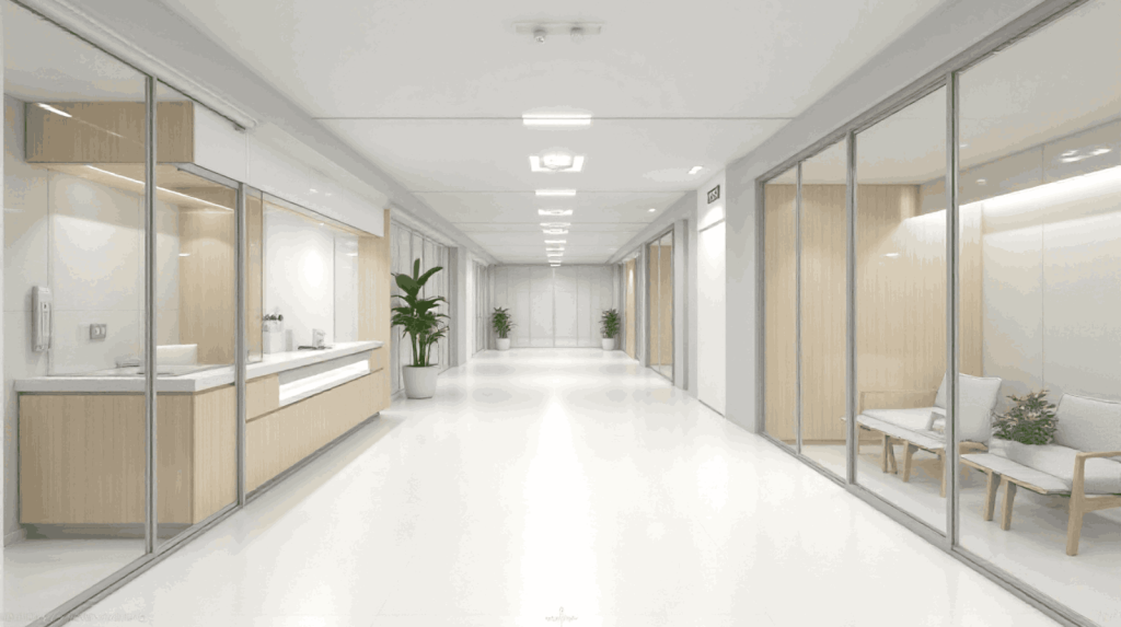 Tambahkan elemen kayu muda atau tanaman kecil untuk menghindari kesan monoton. Lantai dengan material antibakteri seperti granit matte membantu menjaga kebersihan dan keamanan pasien.