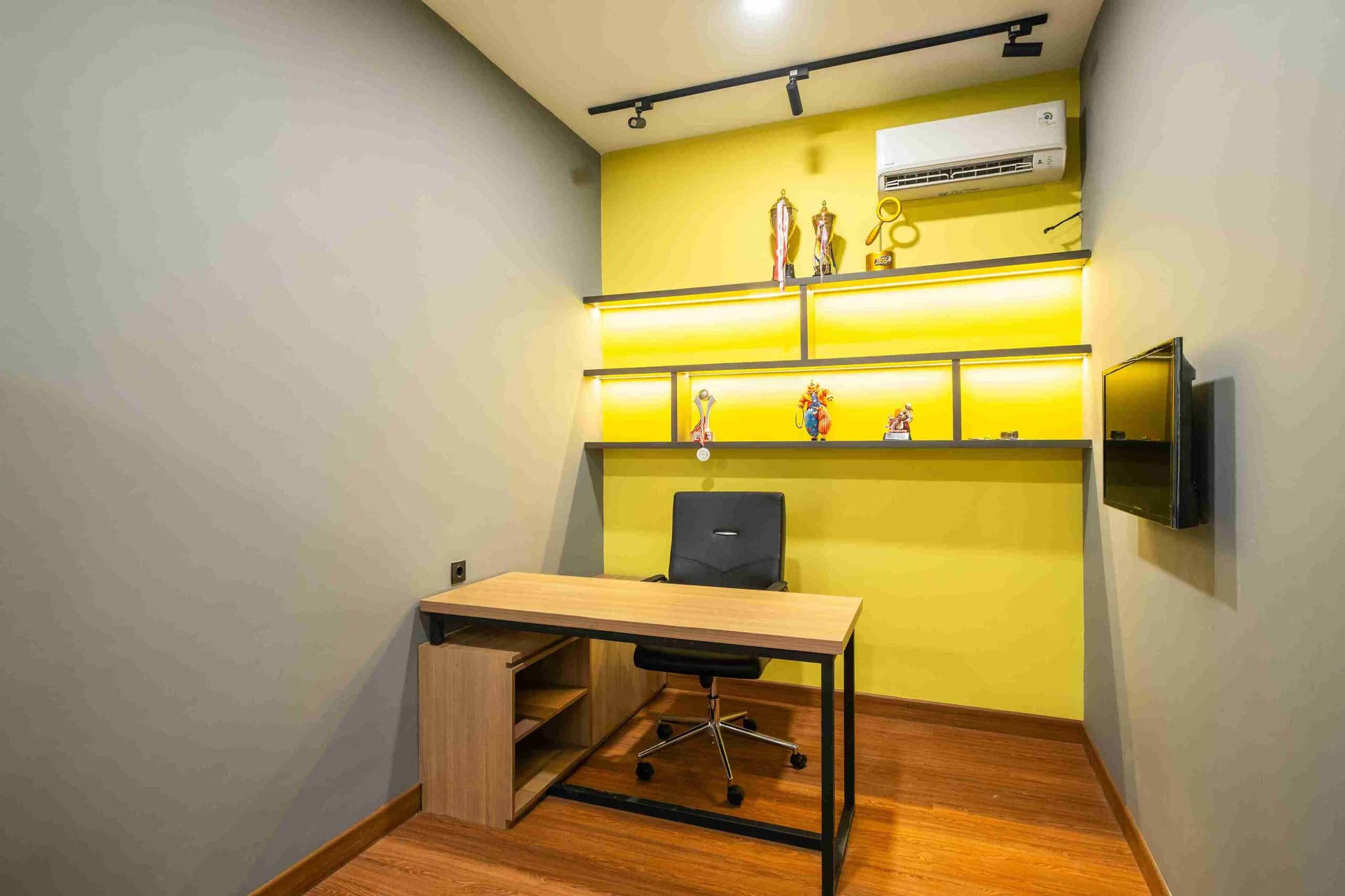 Palet warna netral yang dipadukan dengan dinding aksen berwarna cerah menciptakan suasana profesional sekaligus energik.
