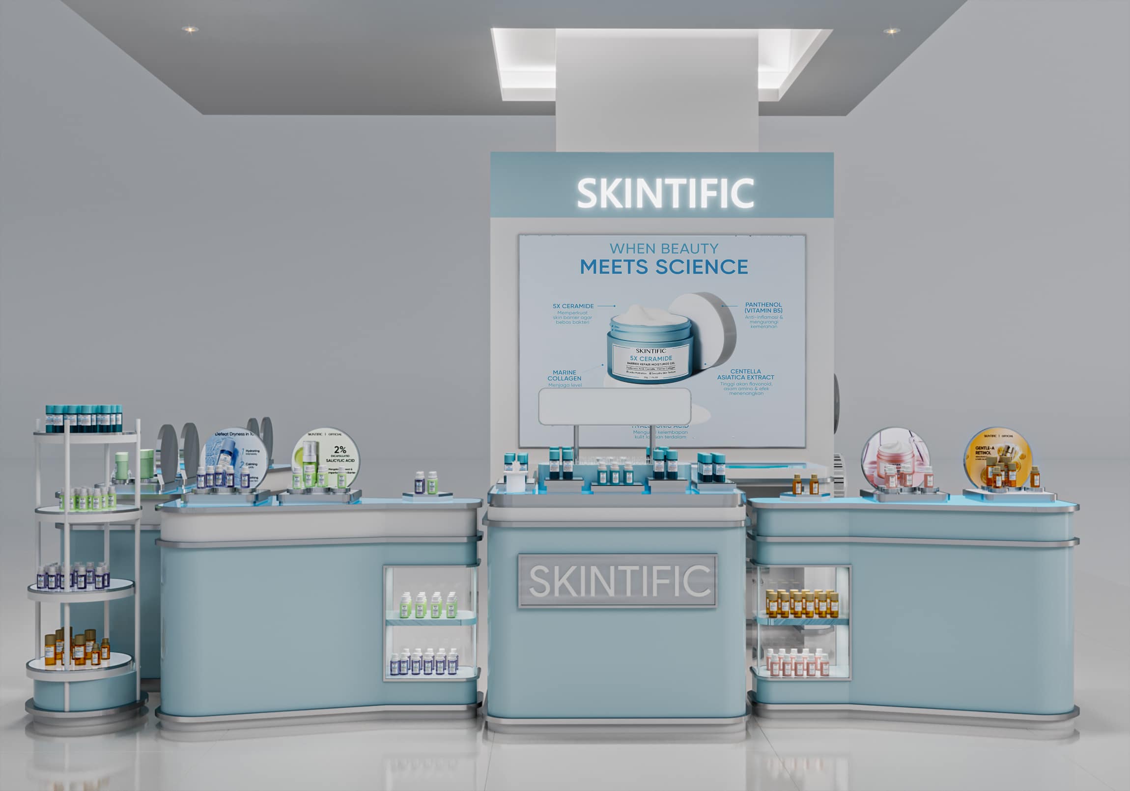 Skintific, brand skincare asal Kanada, ingin menghadirkan booth yang merepresentasikan filosofi mereka When Beauty Meets Science. Tantangan utamanya adalah menciptakan desain yang tidak hanya modern, namun juga simple, clean, dan fungsional layaknya lab science agar produk tetap menjadi pusat perhatian. HOIRe menjawab kebutuhan ini dengan menghadirkan desain booth bernuansa clean modern melalui perpaduan warna soft blue, display modular, serta pencahayaan yang menegaskan karakter brand. Hasilnya, booth Skintific berhasil memancarkan kesan profesional dan premium sekaligus menonjolkan produk secara optimal.